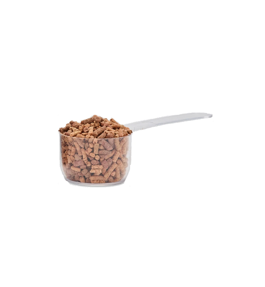 - Ruwvoer + granen: 2 maatschepjes per dag.