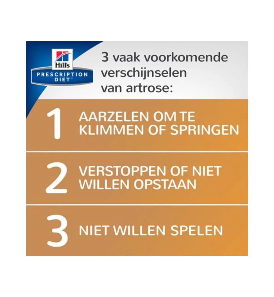 De Hill’s Presciption Diet J/D Mobility dieetvoeding is een klinische bewezen volwaardige voeding voor katten die te maken hebben met gewrichtsaandoeningen zoals bijvoorbeeld artrose. Onderzoeken hebben aangetoond dat de bewegelijkheid bij katten met gewrichtsproblemen binnen 30 dagen na het starten van deze voeding verbeterd.